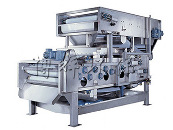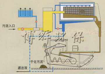 通过污泥变流量泵泥浆先进入混凝给料系统,同时释放后的絮凝剂在变流量药剂泵的作用下也进入系统内然后通过管式水中造粒使污泥与絮凝剂进行充分混合,根据污泥性能调节絮凝剂和污泥混合比,使污泥达到好的凝聚状态,然后进入带式浓缩机,在快速排水机构的作用下,大量的水快速通过网带被滤除,浓缩后的污泥被卸泥装置下到脱水机上重力脱水段,大部分游离水在重力作用下通过网带被滤除,因游离水的分离网带快速被自由状污泥覆盖,上层形成“水池”现象,同时网带向前运行将污泥翻转至下网带重力脱水段,“水池”被翻转到下网带,在重力作用下将原形成的“水池”通过网带被滤除,随着网带的运行污泥进入揳形预压脱水段,污泥在“揳”性挤压段中一方面使污泥平整,另一方面污泥受到轻度挤压开始进行预压脱水。接着进入S形压力脱水段,污泥在S形压力脱水段中被夹在上、下两层滤带中间经若干个由大到小的辊筒反复挤压剪切。污泥在挤压力和剪切力作用下逐步脱水,形成滤饼。接着通过卸料装置将滤饼从滤带上剥离下来,用大于0.5MPa的清水对各滤带进行自动清洗达到滤带再生目的。整个污泥脱水工作全部完成。该设备为24小时连续运行。