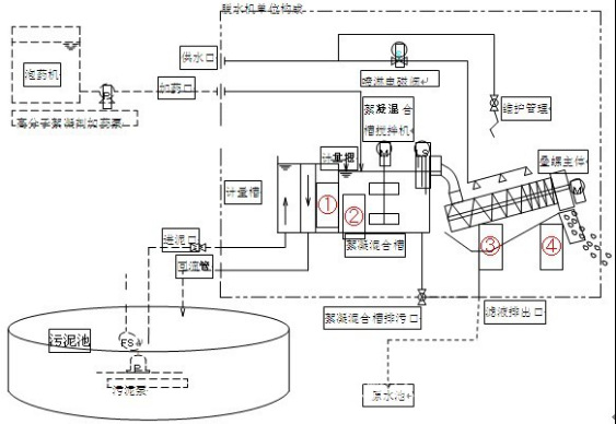 2、在絮凝混合槽内注入高分子絮凝剂,通过搅拌后形成矾花,经过叠螺主体浓缩部的重力浓缩后进入脱水部。