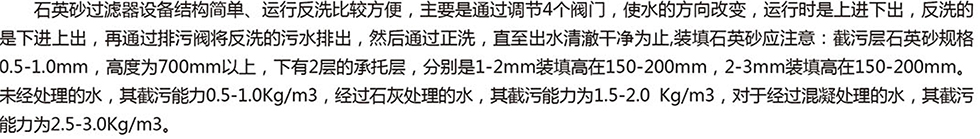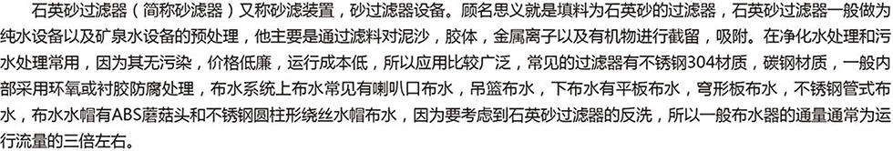 石英砂过滤器是去除水中悬浮物的手段之一,是污水深度处理、污水回用和给水处理中重要的单元。其作用是将水中已经絮凝的污染物进一步去除,它通过滤料的截留、沉降和吸附作用,达到净水的目的。